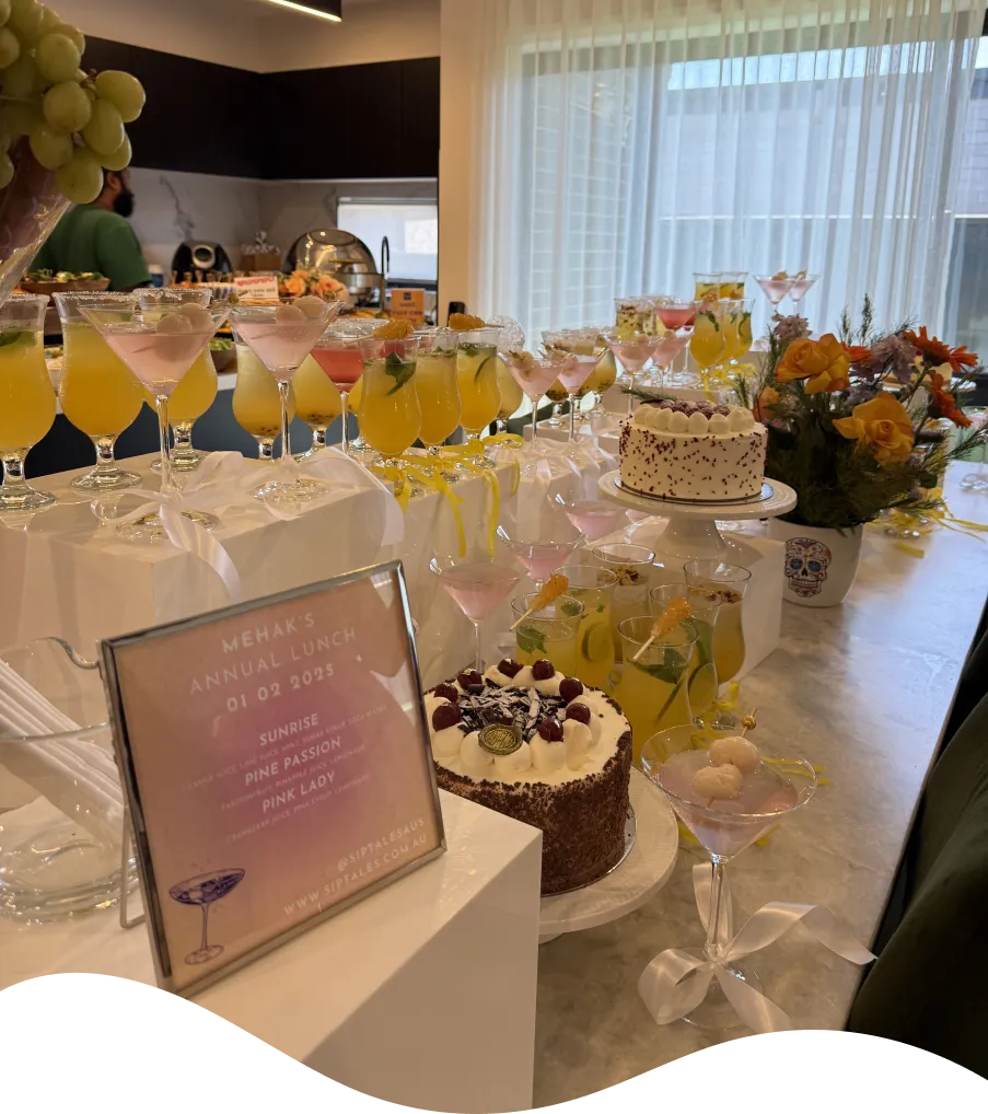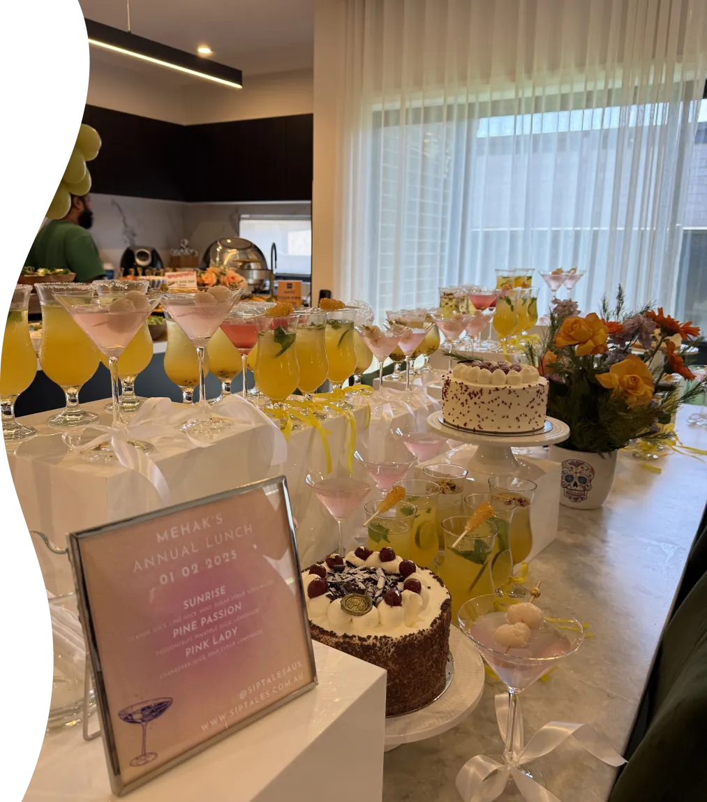 SipTales offers a wide range of event services, is there is something for everyone! Whether you need a stunning set of mocktails for any number of guests, acrylic riser hire for your catering display, cart/table hire, floral arrangements, event assistance, BTS content creator and MORE. Review our service list and enquire today to see what works best for you.